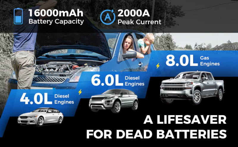 (1) leistungsstarke Auto Starthilfe. Kann es starten eine 12-volt toten batterie in sekunden und bietet über 25 jump beginnt auf einem einzigen volle ladung für motoren bis zu 10,0 L Benzin und 8,0 L Diesel.