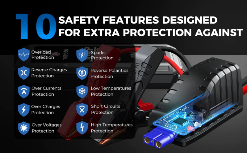 (5) Heavy-duty Kupfer Schellen für Sicherheit. Dieser starthilfe hat bestanden alle UL2743, FCC, CE, PSE, und ROSH vorschriften. Schutze umfassen reverse polarität schutz, verpolung schutz, reverse und überladung ladung schutz, kurzschluss schutz, und mehr.