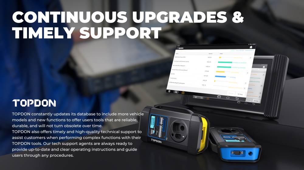 TOPDON aktualisiert seine Datenbank ständig, um weitere Fahrzeugmodelle und neue Funktionen aufzunehmen, um den Benutzern Werkzeuge anzubieten, die zuverlässig und langlebig sind und mit der Zeit nicht veraltet sind. TOPDON bietet auch rechtzeitigen und qualitativ hochwertigen technischen Support, um Kunden bei der Verwendung von TOPDON-Tools zu unterstützen. Unsere technischen Support-Mitarbeiter sind immer bereit, aktuelle und klare Anweisungen zu geben und Benutzer durch alle technischen Probleme zu führen.