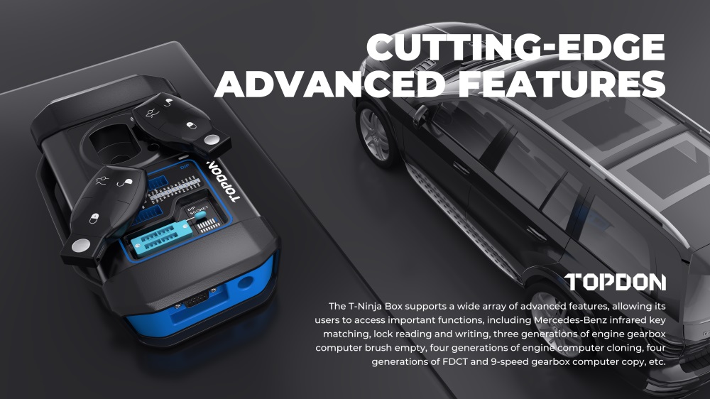 Die T-Ninja Box unterstützt eine breite Palette fortschrittlicher Funktionen, die es ihren Benutzern ermöglichen, auf wichtige Funktionen zuzugreifen, darunter Mercedes-Benz-Infrarotschlüsselabgleich, Lesen und Schreiben von Schlössern, drei Generationen von Motorgetriebe-Computerbürsten leer, vier Generationen von Motorcomputer-Klonen, vier Generationen von FDCT und 9-Gang-Getriebe-Computerkopie.