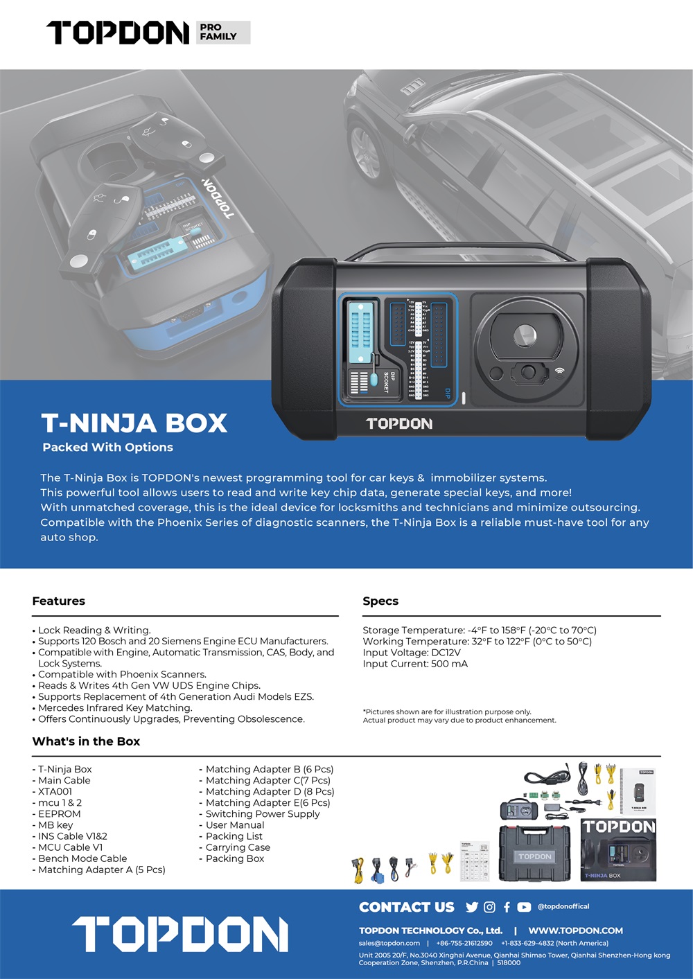 Die T-Ninja Box ist TOPDONs neuestes Programmiertool für Autoschlüssel und das Wegfahrsperrensystem. Dieses leistungsstarke Tool ermöglicht es Benutzern, Schlüsselchipdaten zu lesen und zu schreiben, Spezialschlüssel zu generieren und vieles mehr!