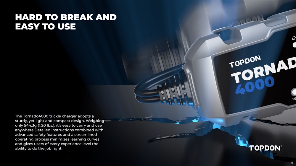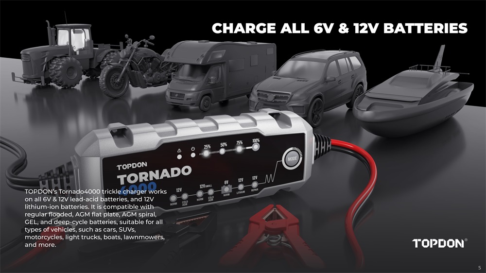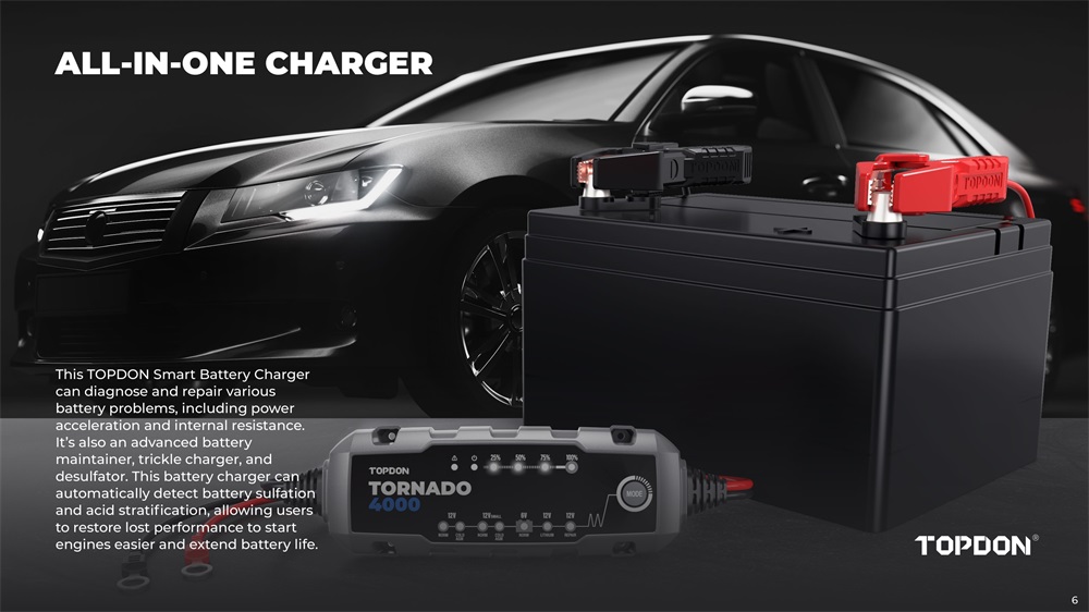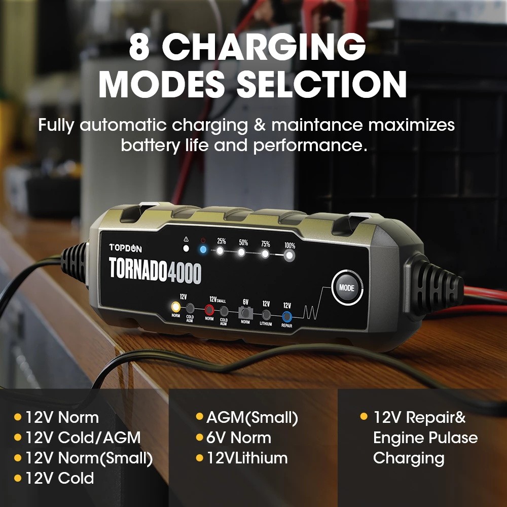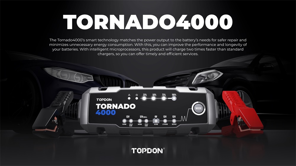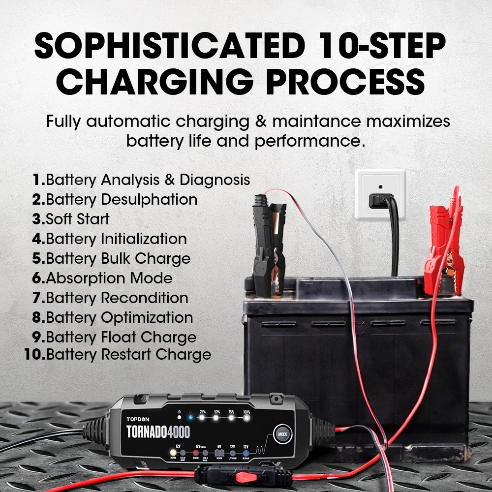 TOPDONT4A (TORNADO4000) server als eine intelligente batterie ladegerät für 6V/12V blei-säure und 12V lithium-säure batterien bis zu 150 amp-stunden, mit zweimal die lade geschwindigkeit, 10 lade schritte, 8 lade modi, licht weightiness, portabilität, benutzerfreundlichkeit, kompakte design und andere außergewöhnliche merkmale, Beweist selbst zu werden sehr sicher und zuverlässig für lade, reparatur, aufrechterhaltung verschiedenen batterien.