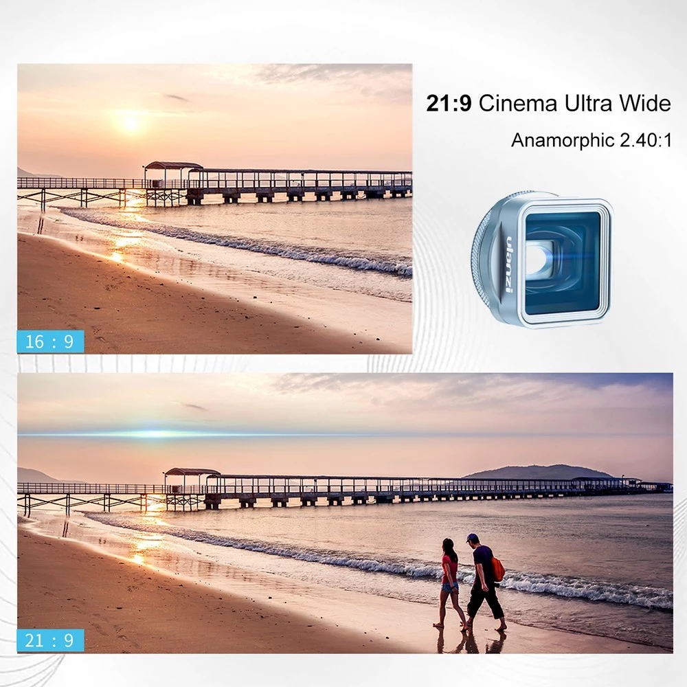 Kreatives anamorphotisches Telefonobjektiv: Dieses anamorphotische Telefon verfügt über eine 21: 9-Filmbildkomposition, einen Breitbildschirm und horizontale Reflexe. Ideal für Handy-Filmemacher.