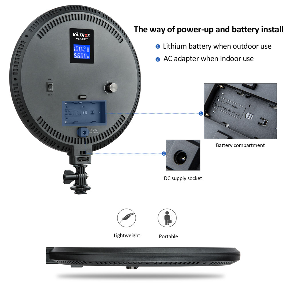 Viltrox VL-500T LED ring licht nimmt die neueste LED honeycomb desgin, die ist von hoher helligkeit und genaue farbe temperatur. es hat weiche licht, weniger wärme und ist umwelt und langlebig. die HD LCD display macht es einfach zu bedienen. es ist geeignet für porträt photograpy, kinder fotografie, makro fotografie, stillleben fotografie und andere arten von fotografie.