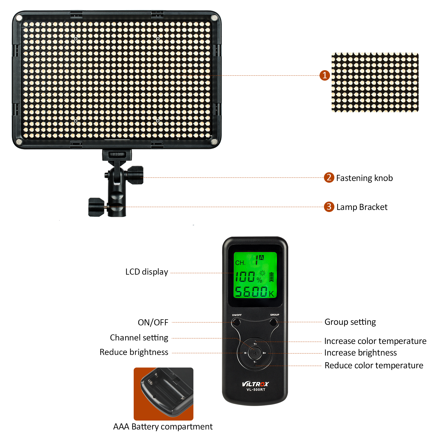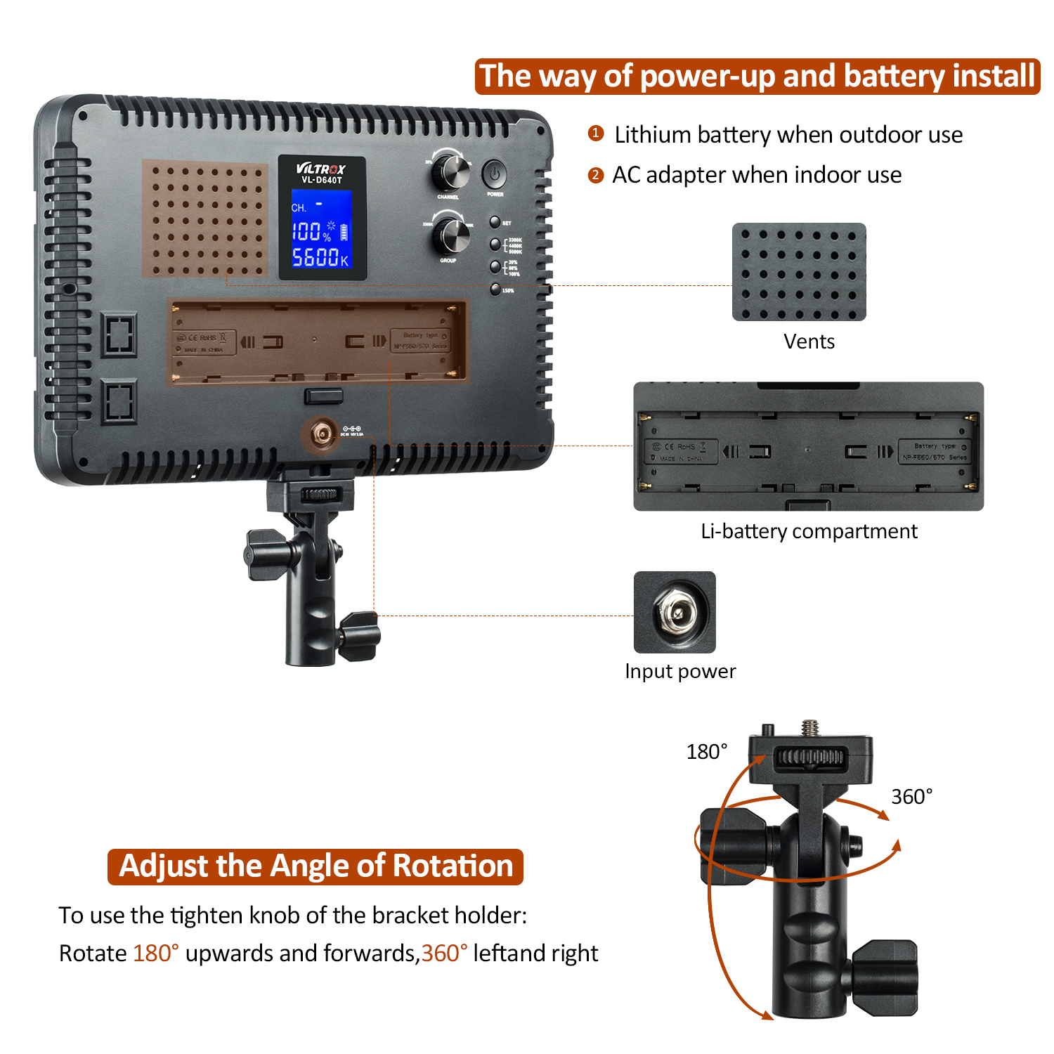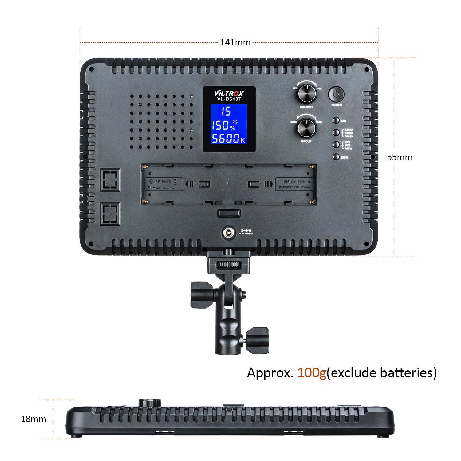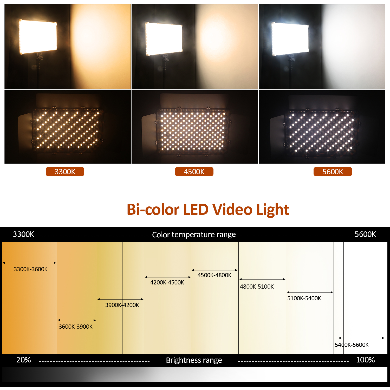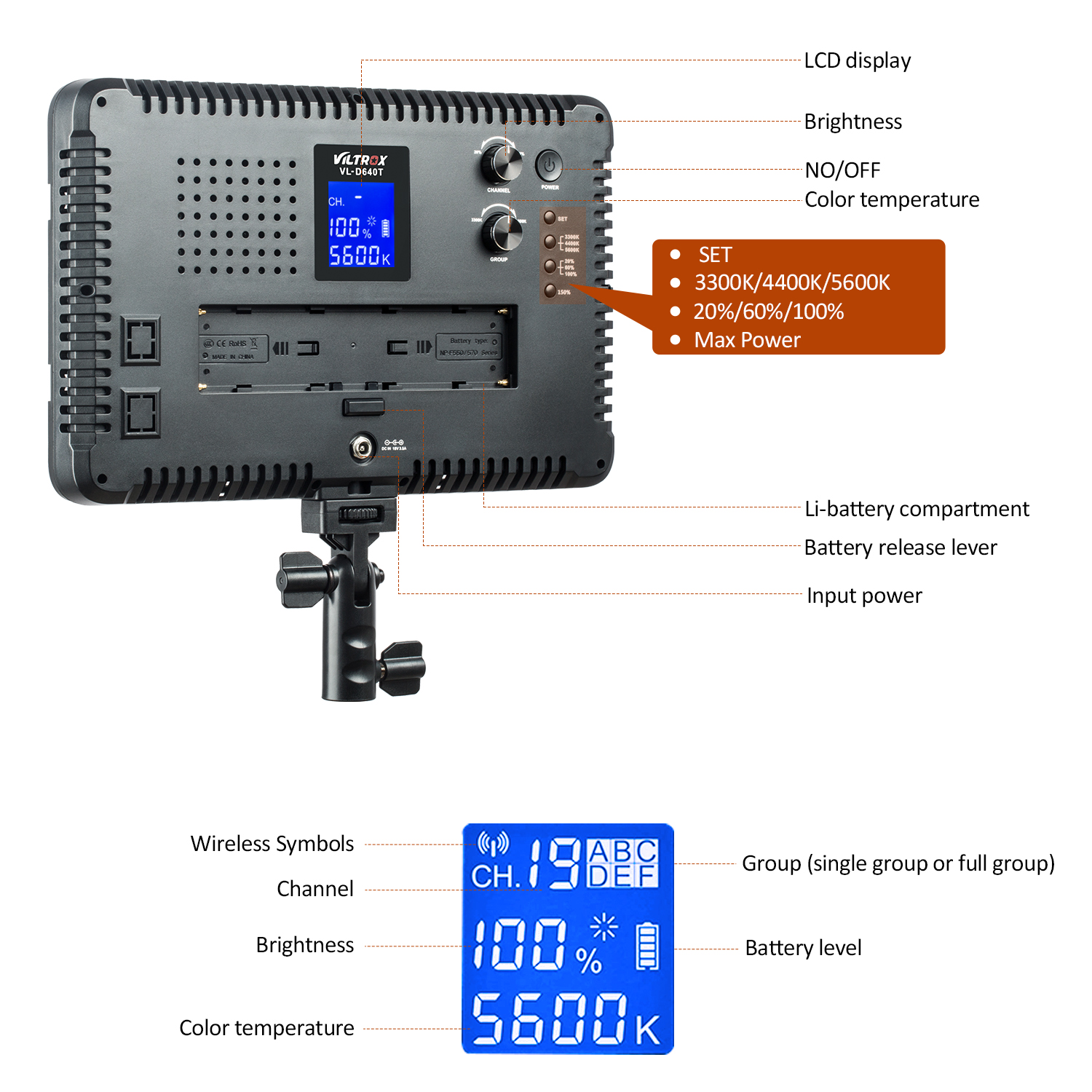 Spezielle entwickelt: schnell taste für farbe temperatur 3300K-4400K-5600K und Helligkeit 20%-60%-100%; und Überschüssige ausgang taste (150%), sie können erhalten eine 75W power ausgang für 1 sekunde.