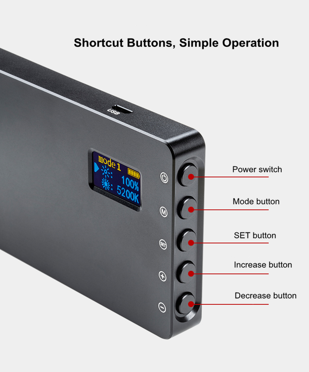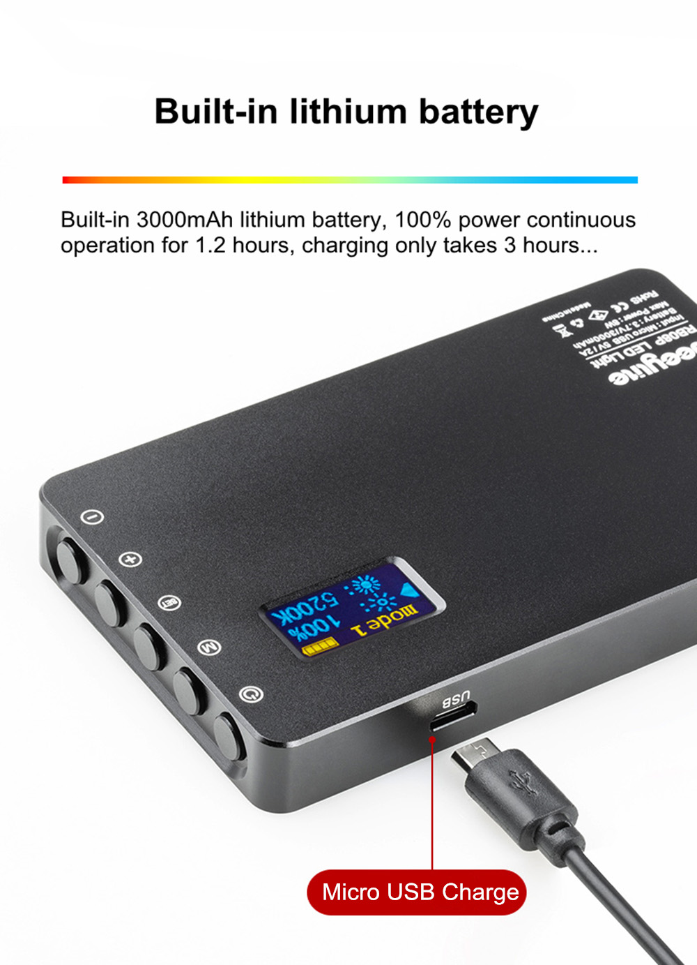 Eingebauter Akku: Das Licht ist mit einem eingebauten wiederaufladbaren 3000-mAh-Lithium-Akku ausgestattet (kann beim Laden nicht verwendet werden). Die Arbeitszeit beträgt 1,2 Stunden (100% voll, 5600K Leistung). Es ist für den Innen- und Außenbereich geeignet, hat einen geringen Stromverbrauch und Umweltschutz und kann über einen USB-Anschluss (USB-Kabel im Lieferumfang enthalten) aufgeladen werden.