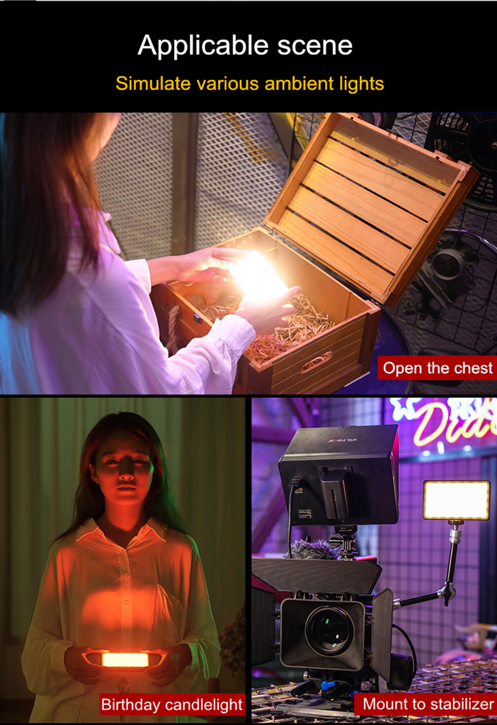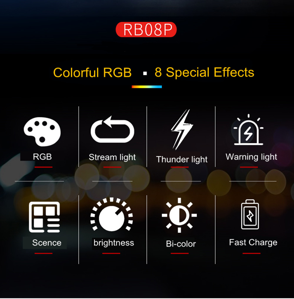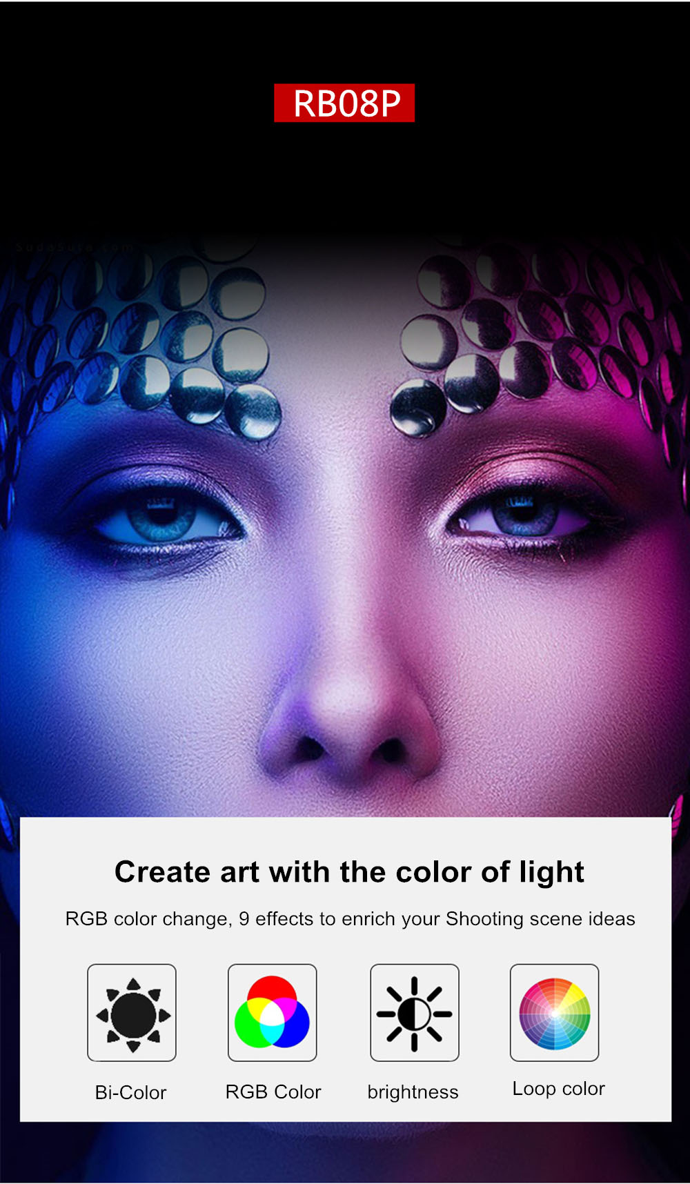 TeileZwei-Farben-RGB-Licht: 360 Arten einstellbarer Farben, jede Farbe hat einen Sättigungsgrad von 100 und eine Helligkeit zur Anpassung. Farbtemperaturbereich: 2500K ~ 8500K (± 300K), exakte Helligkeitseinstellung von 0 ~ 100%.