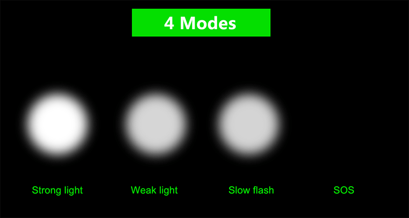 Modi: Starkes licht, schwaches licht, langsam flash, SOS