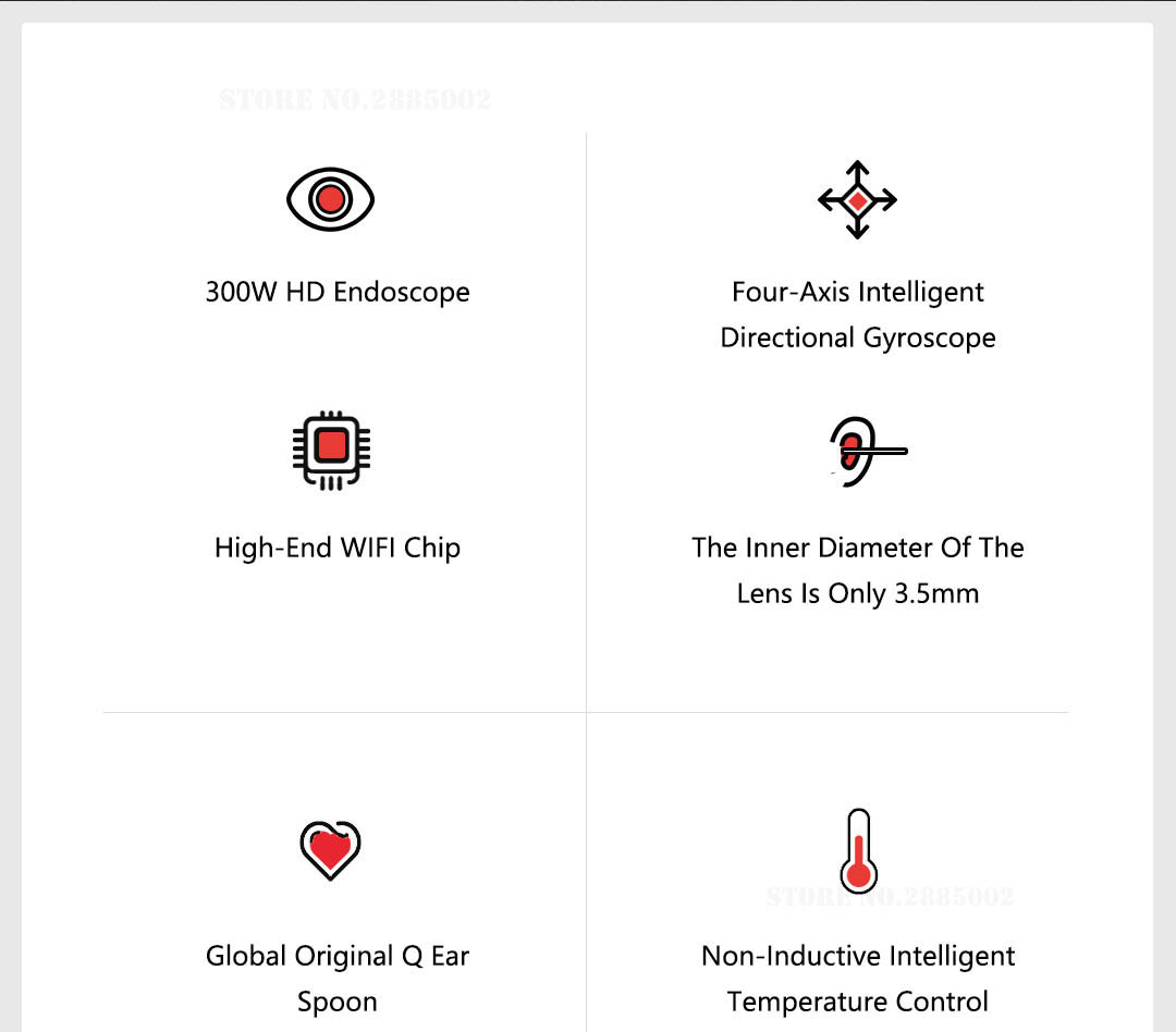 Revolutionäre 3,0-Megapixel-HD-Kameratechnologie mit automatischer Fokussierentfernung von 0,5 Zoll, 141 * 13 * 13-mm-Objektiv mit 6 LED-Leuchten mit Anti-Fog- und Anti-Staub-Technologie bietet detailliertere und mikroskopischere Ansichten. Das Ohrfernrohr kann als trinkbares digitales Mikroskop verwendet werden. Sie können es verwenden, um Ihre Mikrowelt mit Ihren elektronischen Geräten zu erkunden!