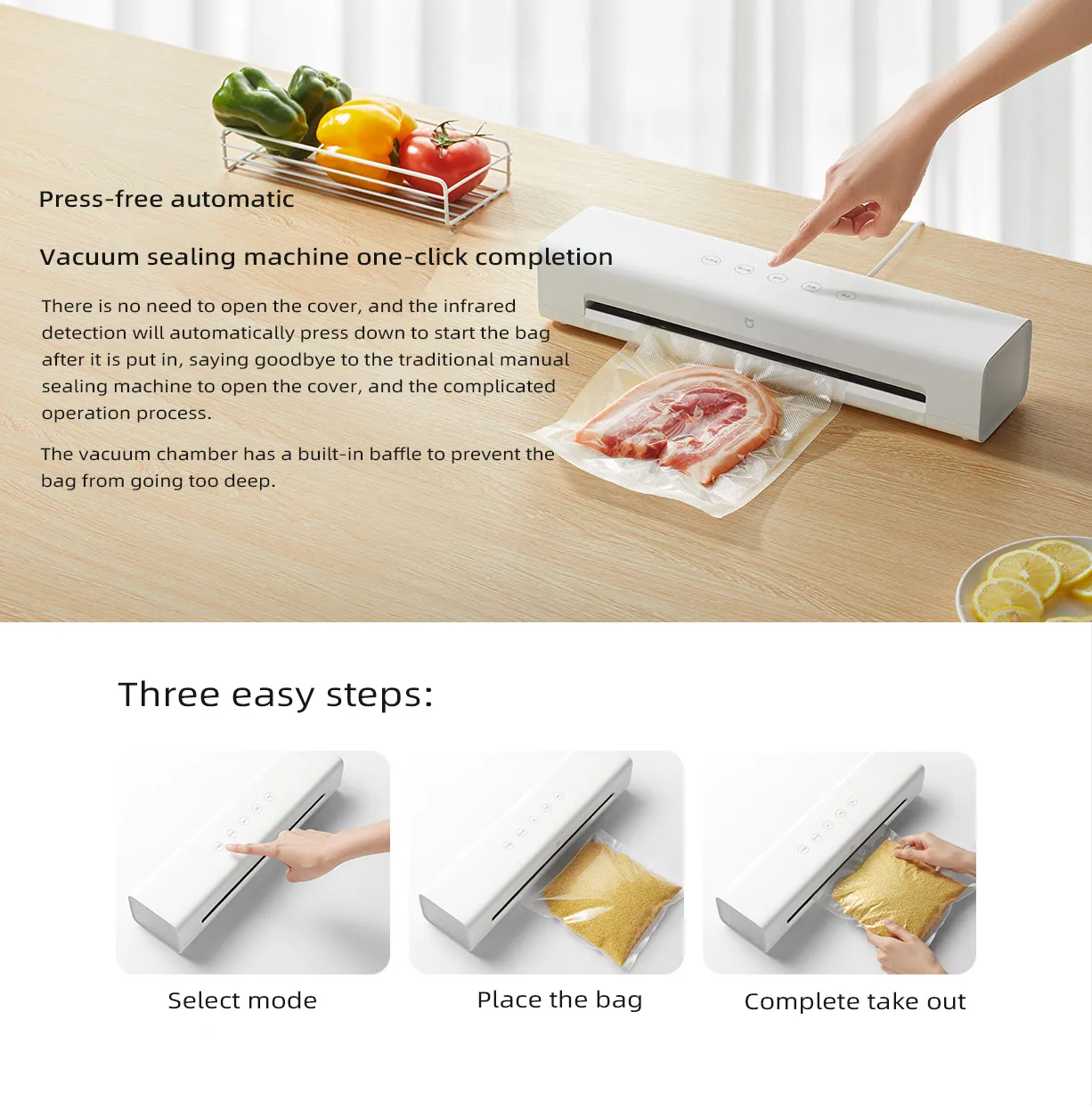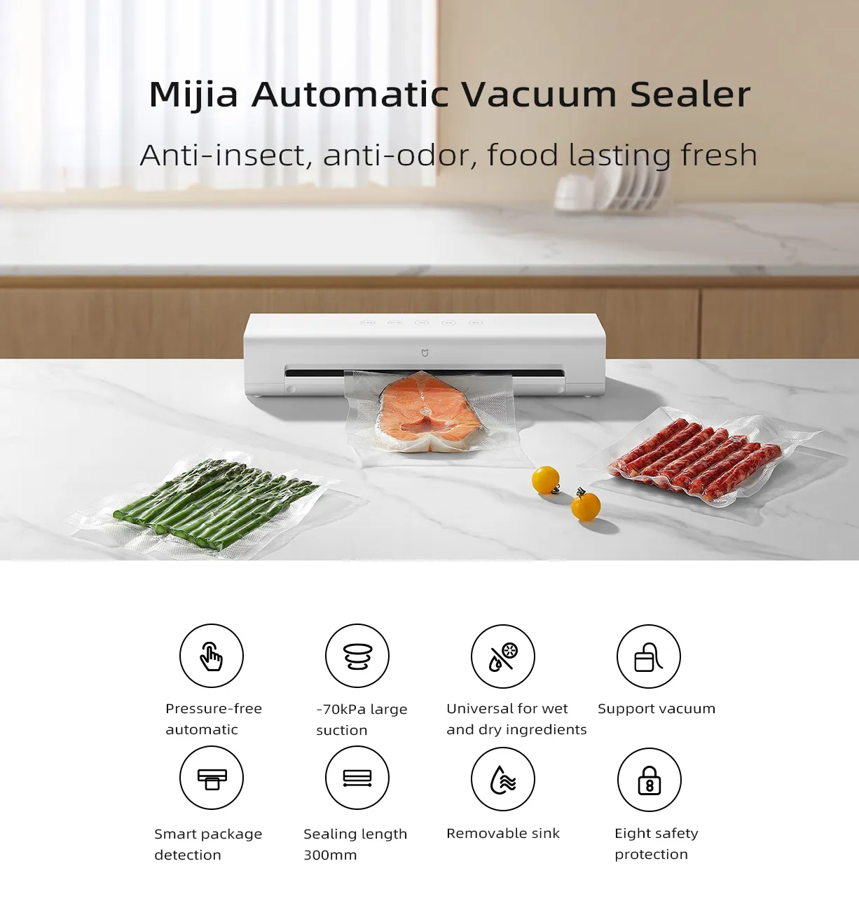 Die automatische Vakuumiermaschine von Xiaomi funktioniert vollautomatisch ohne Drücken, die Vakuumierung erfolgt mit einer Taste. Benutzer müssen den Deckel nicht anheben, die Infrarot-Erkennung erfolgt automatisch, nachdem der Beutel platziert wurde, indem er nach unten drückt, um zu starten, der Vorgang des Staubsaugens, Verschließens und automatischen Anhebens erfolgt vollautomatisch.