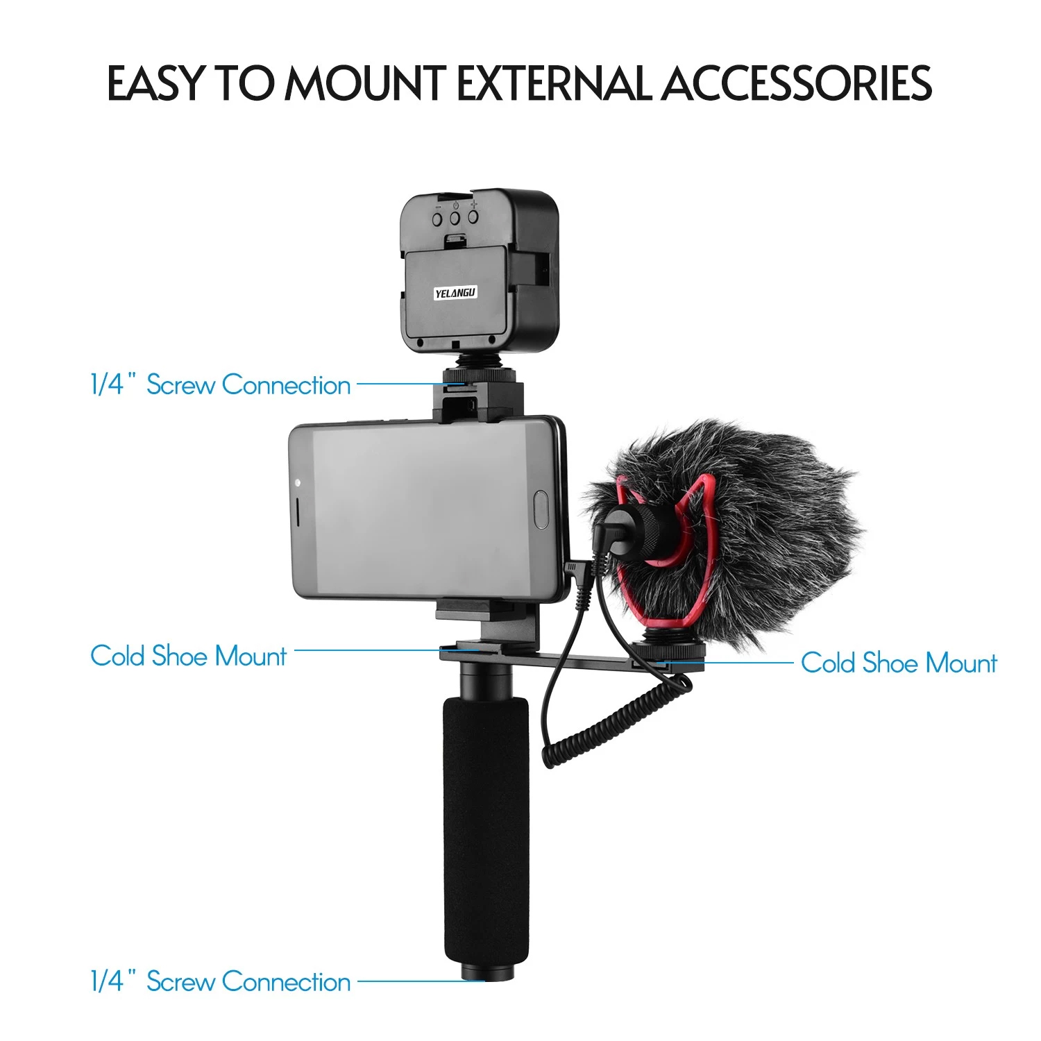 Mit einer 1/4 "Schraube an der Oberseite des Griffs zur Befestigung des Smartphone-Halters und einem 1/4" Schraubenloch an der Unterseite zur Befestigung von anderem Fotozubehör.