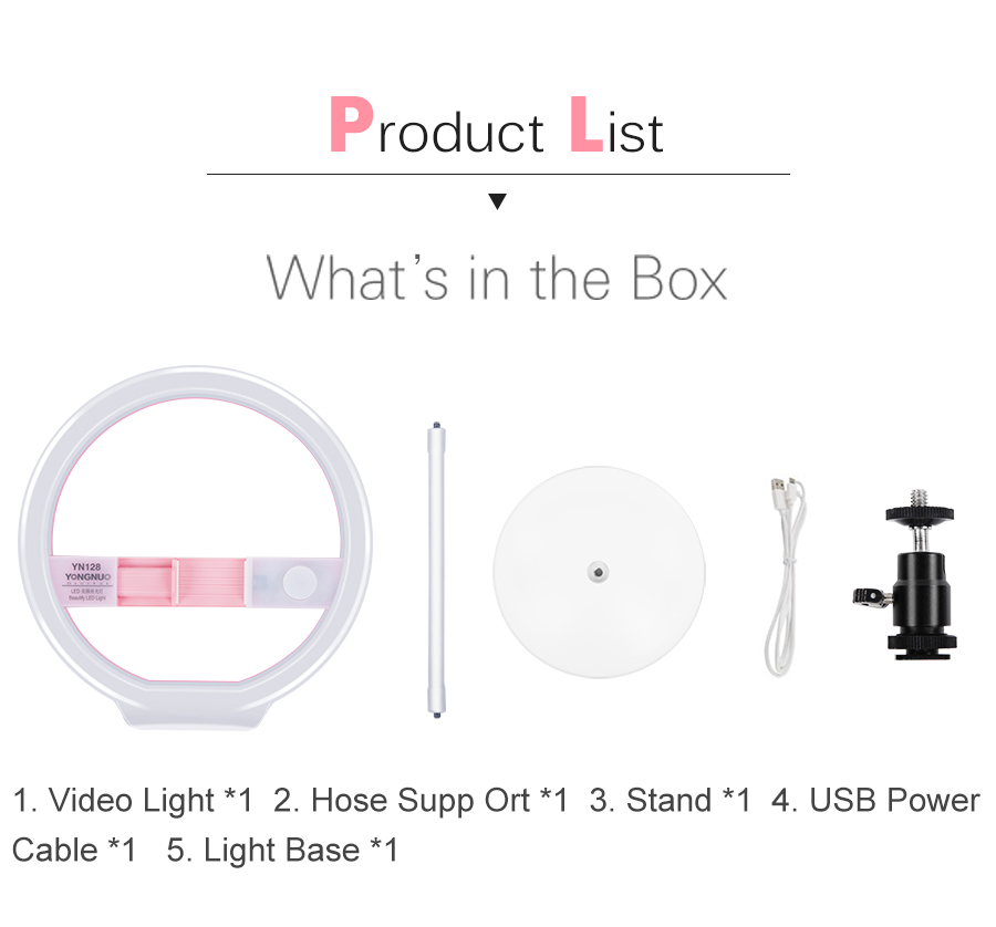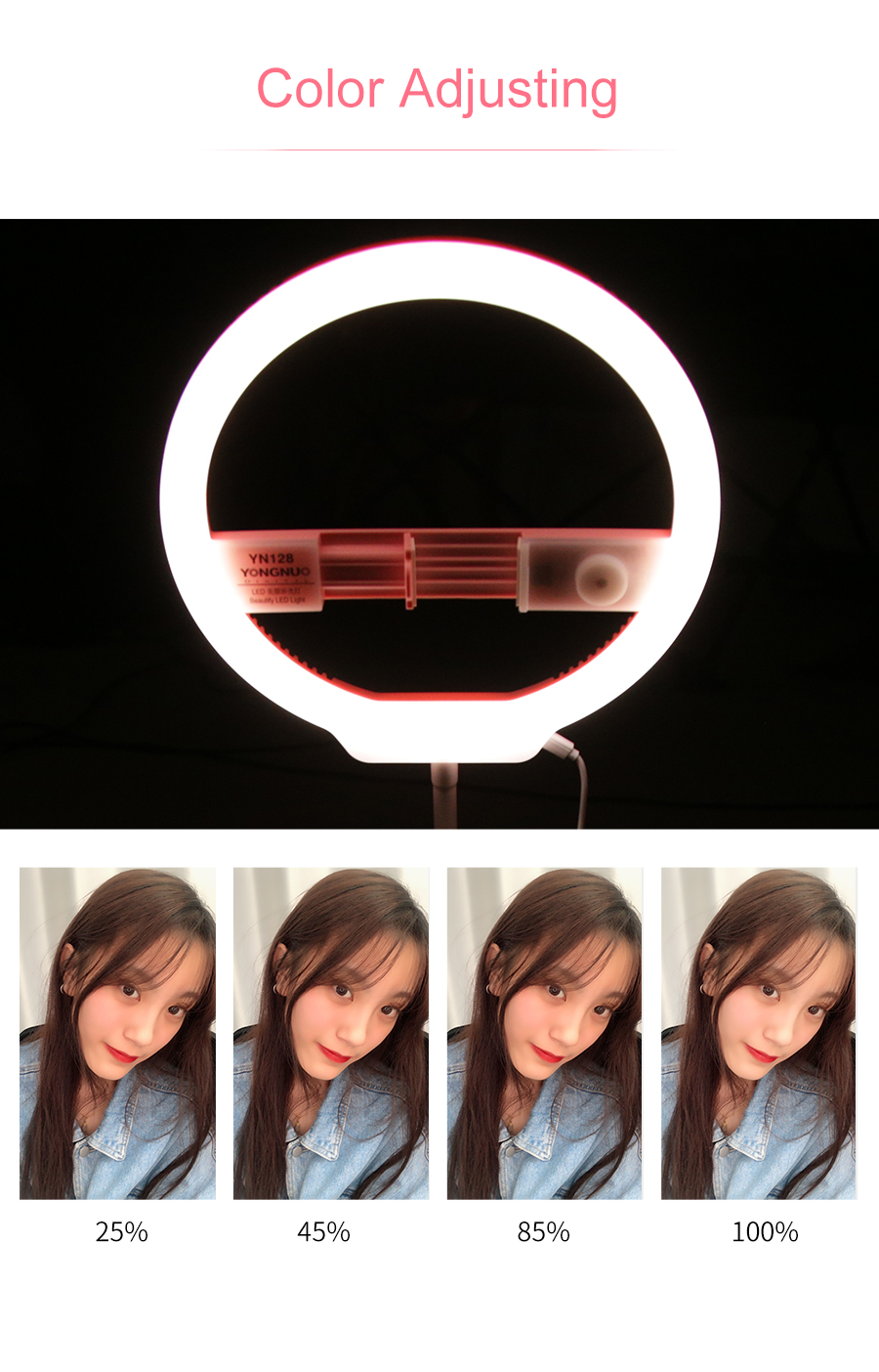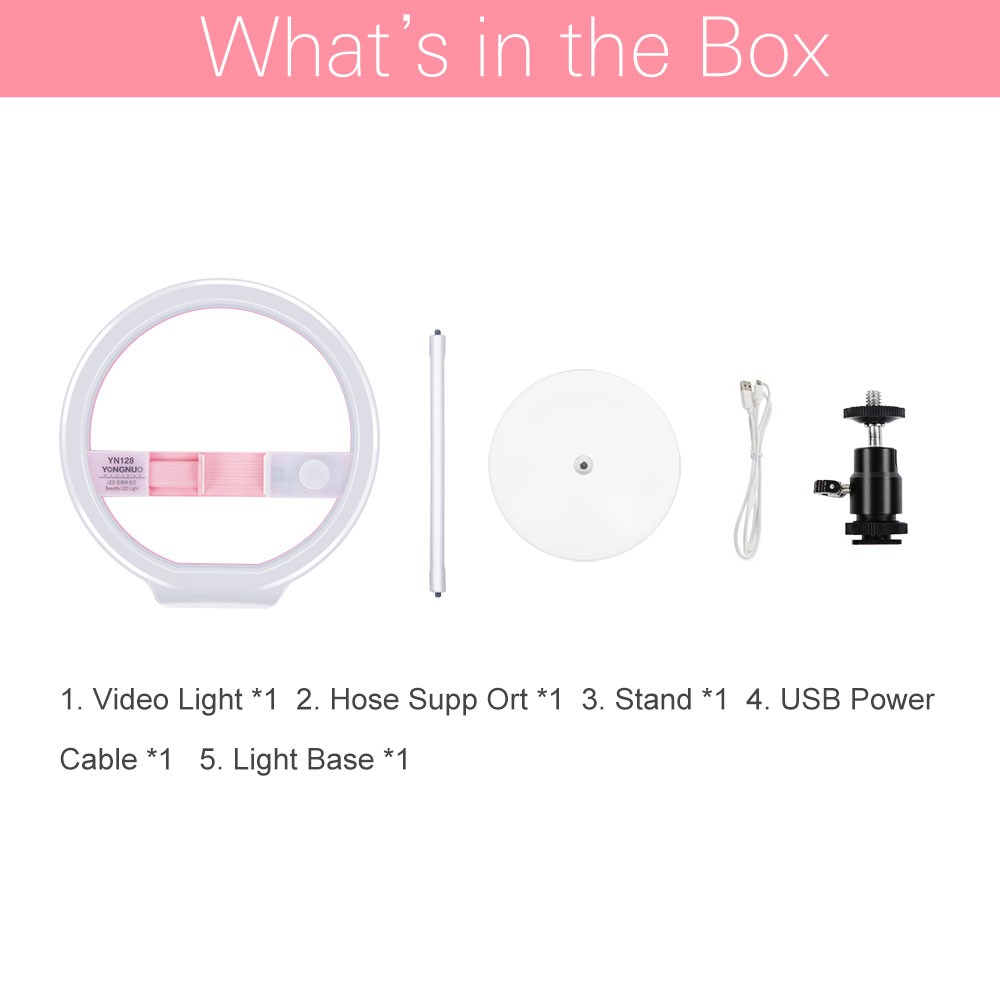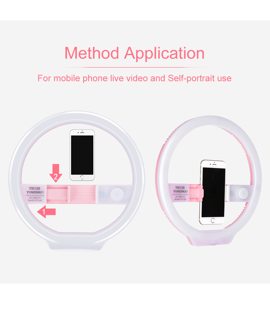 YN128 ist ein neues tragbares LED-Licht zum Verschönern, das speziell für Live-Videos und Selfies entwickelt wurde. YN128 nimmt ein ringförmiges Erscheinungsbild an. Da positives Einfülllicht weicher und viel gleichmäßiger ist, kann eine perfekte Aufnahme von Fanglichtern erzielt werden. Der YN128 verfügt über drei Lademethoden, um unterschiedliche Anforderungen in verschiedenen Szenarien zu erfüllen: Telefonladegerät, tragbare Power Bank und Computer-USB-Anschluss. Mit einer Schlauchhalterung, die in jedem Winkel eingestellt werden kann, können Sie je nach praktischem Bedarf Fotos oder Live-Videos aufnehmen.