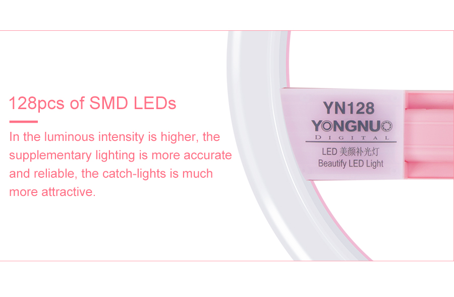 YN128 verfügt über 128 Stück SMD-LED. Der Beleuchtungswinkel beträgt bis zu 110 °. Mit hohem CRI, hoher Helligkeit und geringem Energieverbrauch bietet YN128 ausreichend und ausgewogenes natürliches Licht und sorgt für einen schattenfreien Apertureffekt.