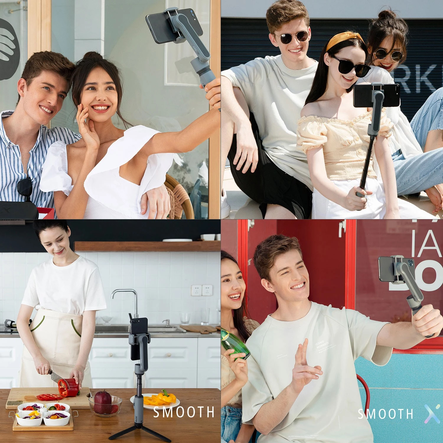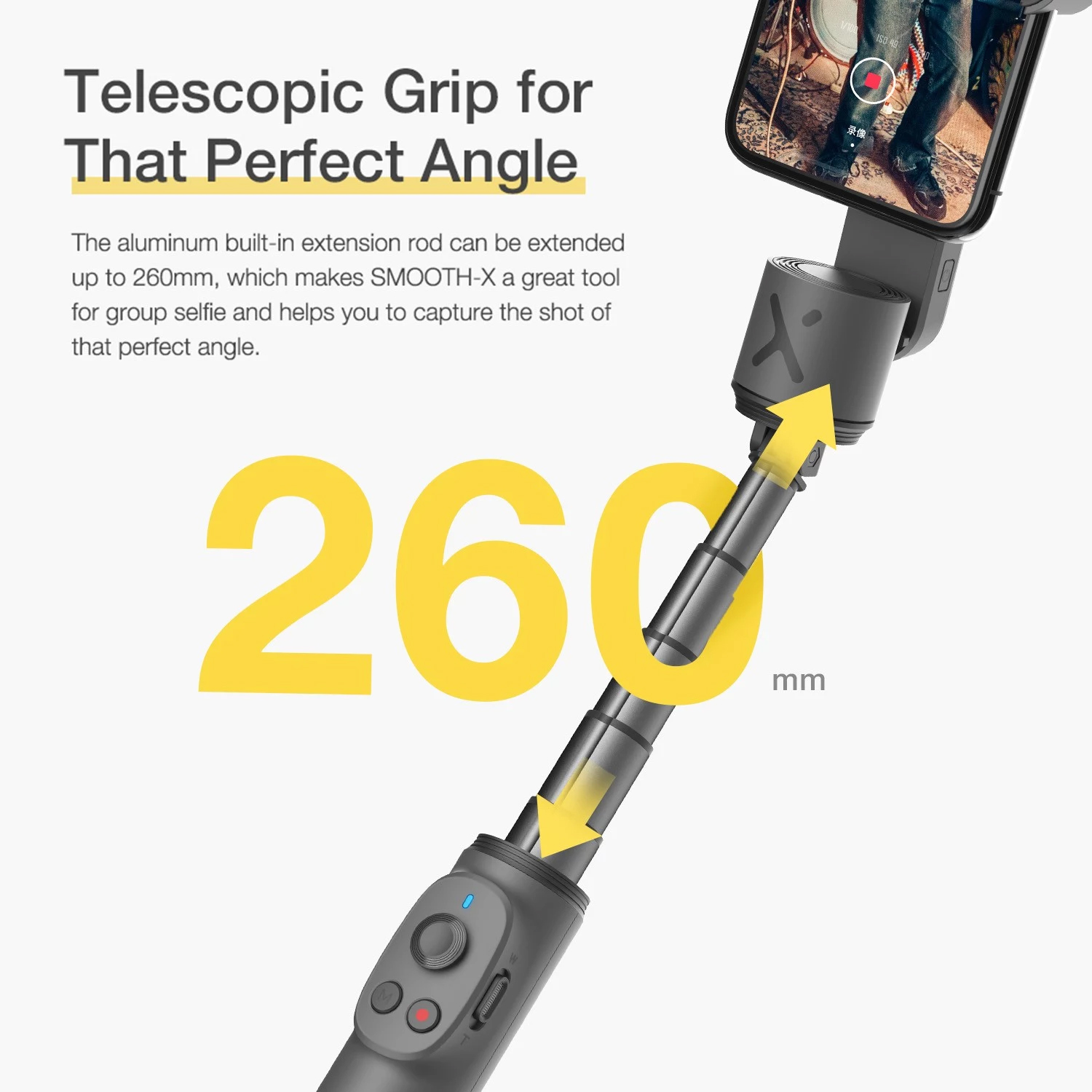 Teleskop-Verlängerungsstange für perfekten Aufnahmewinkel: Die integrierte Aluminium-Verlängerungsstange, die bis zu 260 mm verlängert werden kann, macht SMOOTH-X zu einem großartigen Werkzeug für Gruppen-Selfies und hilft Ihnen dabei, die Aufnahme mit perfektem Winkel zu erfassen.