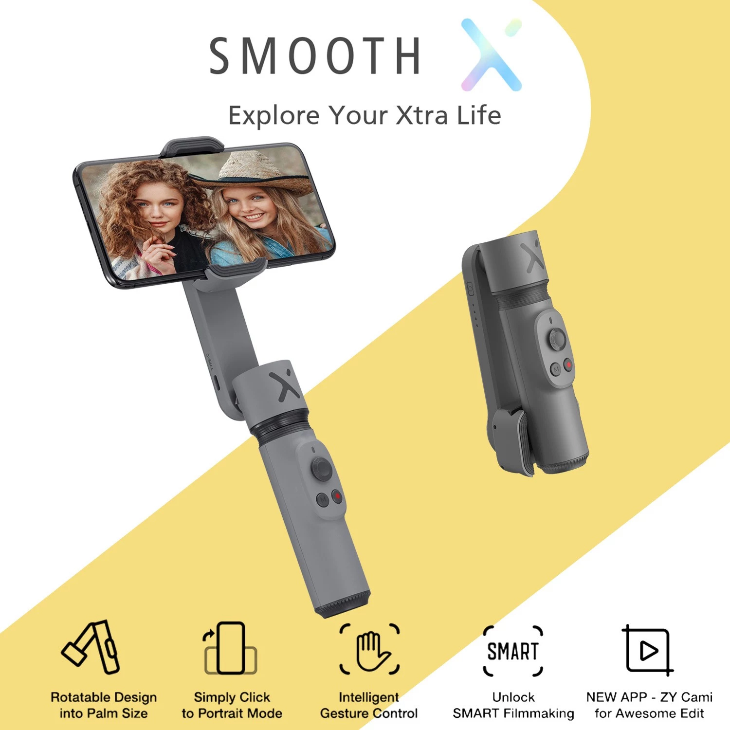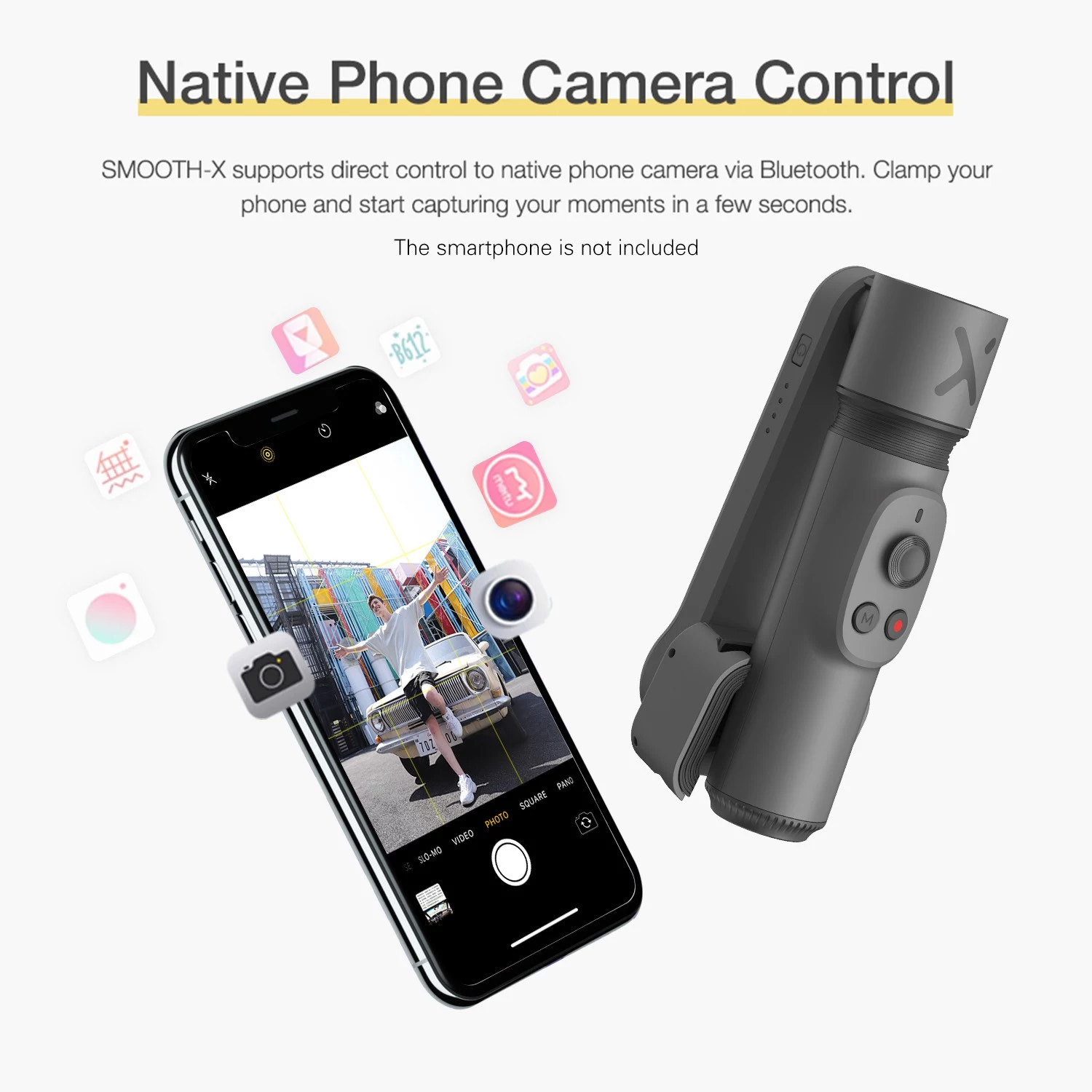 Vollgepackt mit vielen weiteren Funktionen: Objektverfolgung - Rahmen Sie einfach das gewünschte Objekt ein und lassen Sie SMOOTH-X Ihr Objekt verfolgen und fokussieren. unterstützt Zeitlupe, Zeitraffer, Panorama und direkte Steuerung der nativen Telefonkamera über BT.