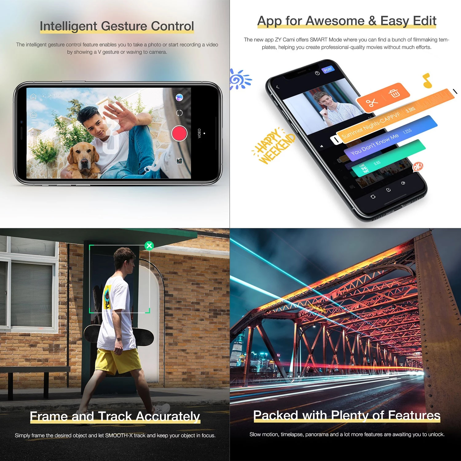 Intelligente Gestensteuerung und neue App für die einfache Bearbeitung: Mit dem Design der Gestensteuerung können Sie ein Foto aufnehmen oder ein Video aufnehmen, indem Sie eine V-Geste zeigen oder der Kamera winken. Die neue APP ZY Cami bietet den SMART-Modus, in dem Sie viele Vorlagen für das Filmemachen finden, mit denen Sie ohne großen Aufwand Filme in professioneller Qualität erstellen können.